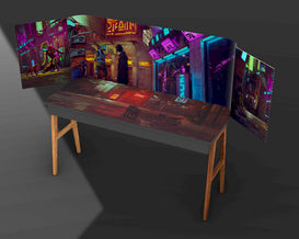 A desk that merges display technology with functional furniture.